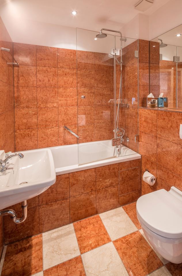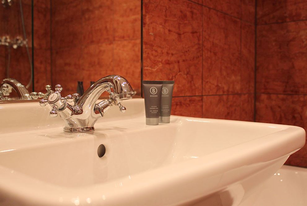 Die hellen Bäder mit ihren großen Spiegelflächen sind mit Flachbett-Regendusche oder Badewanne ausgestattet, meist mit Marmor-oder Designfliesen und teils Designkeramik von Philipp Starck.alle mit Kosmetikspiegel, Personenwaage, Haarfön. und teilweise mit Fenster. Einzelne Zimmer verfügen zusätzlich über ein Bidet. Hochwertige Badkosmetik, Kosmetiktücher und viele andere nützliche Accessoires stehen zur Verfügung.
