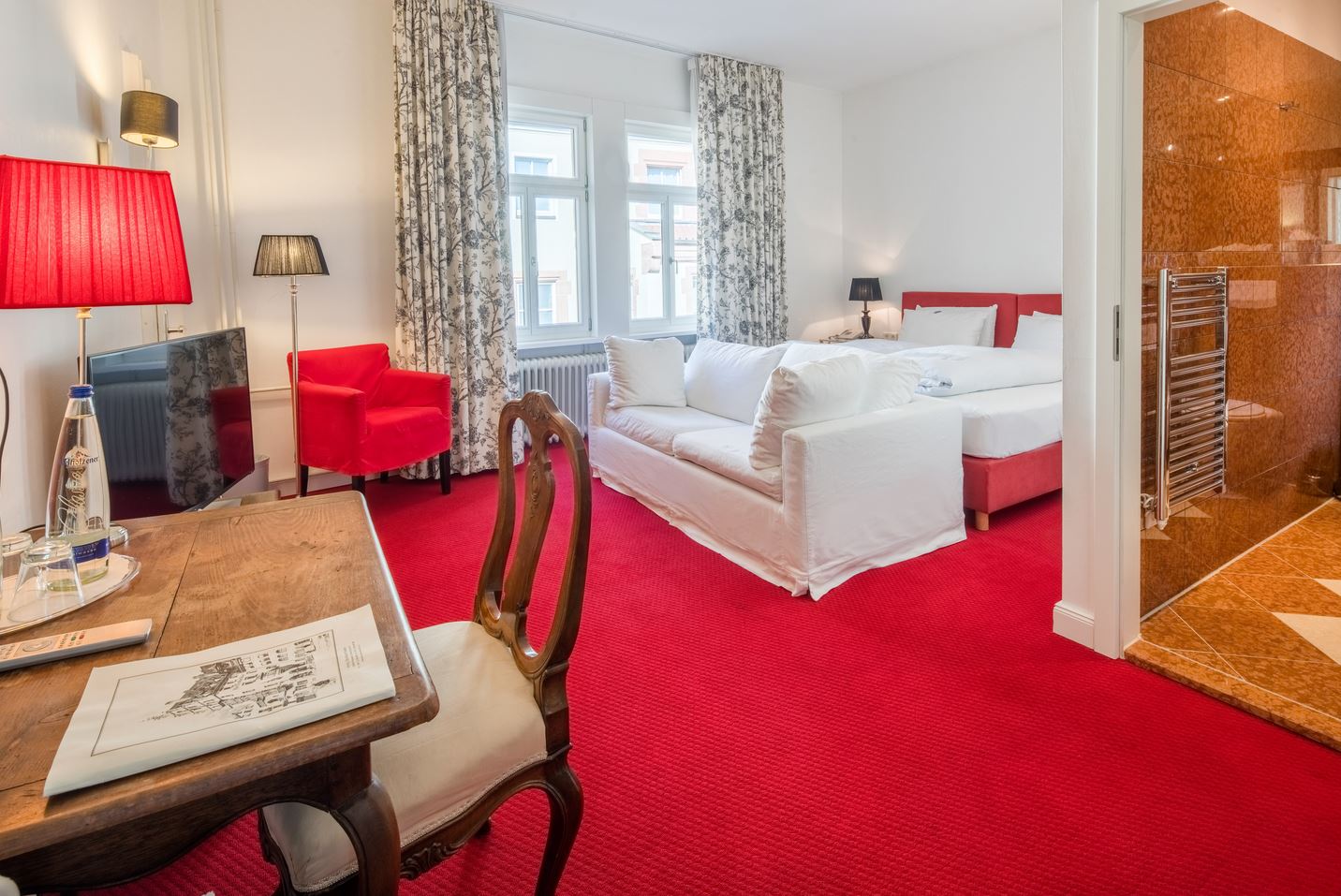 Die immer gehoben, teils luxuriös und sehr individuell, teils mit echten Antiquitäten, eingerichteten Zimmer mit hohen Decken sind mit Schallschutzfenstern (39db), mit Echtholzparkett oder hochwertigem Teppichboden ausgestattet. Wählen Sie zwischen unterschiedlichen Bettbreiten: King mit 200 cm Breite, Doppelbetten mit 180 cm, Queensize mit 160 cm und die Einzelbetten in den Zweibettzimmern mit Breiten zwischen 100 cm und 110 cm, alle bei mindestens 200 cm Länge. Jedes Zimmer hat einen Flachbild TV, eine Bügeleinrichtung, eine Minibar mit einer Auswahl an alkoholischen und nicht-alkoholischen Getränken und einen elektronischen Tresor. Es stehen für jede Übernachtung kostenlos 2 Flaschen Premium-Mineralwasser (0,7l) und eine kostenlose Auswahl an Tee-und löslichem Kaffee inklusive Wasserkocher und Geschirr zur Verfügung.Slipper und flauschige Bademäntel sind selbstverständlich.